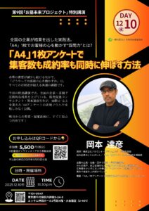 本講演では、A4アンケートを活用して反応率を高め、売上を大きく伸ばす実践的手法を、事例を交えながら具体的に学ぶことができます。